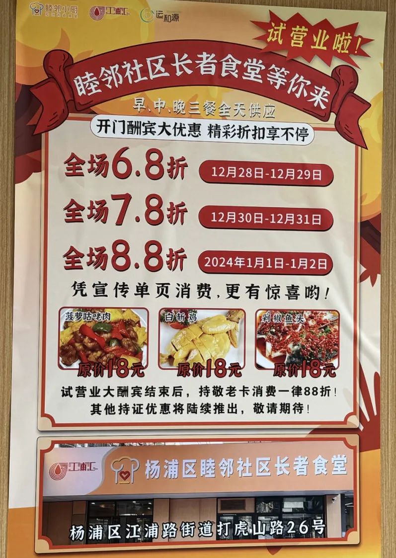 试营业期间,杨浦区睦邻社区长者食堂打虎山路店推出打折优惠活动。此外,食堂也有长期的长者补贴举措。社区居民只要出示敬老卡,就能直接享受8.8折优惠。杨浦区睦邻社区长者食堂打虎山路店运营负责人顾晓宇介绍,食堂还推出了18元敬老自选套餐,凭敬老卡到店即可购买,包含三菜一汤,且每一个菜项都有三道菜肴可供老人“三选一”,方便大家根据自己口味来搭配。