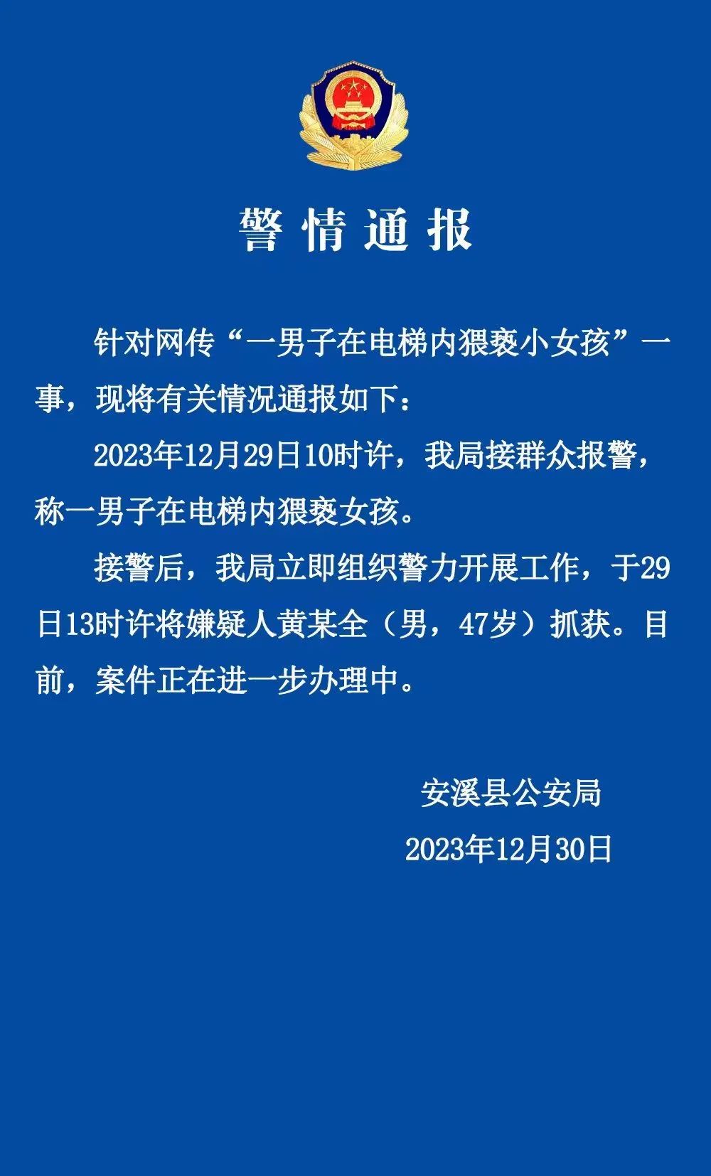 12月30日,福建安溪公安通报网传“一男子在电梯内猥亵小女孩”有关情况:12月29日10时许,我局接群众报警,称一男子在电梯内猥亵女孩,接警后,我局立即组织警力开展工作,于29日13时许将嫌疑人黄某全(男,47岁)抓获。目前,案件正在进一步办理中。