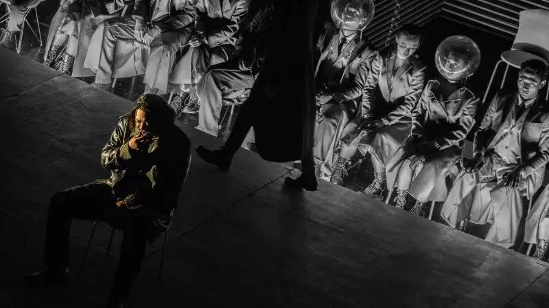演出至《邯郸记》一章节,灯昏暗下来的光景里,孟京辉从下场门的侧目条里遛着边儿上了台,就穿着他那天去剧院的衣服——一身黑色,夹克里面是一件灰色T恤,他举着几页纸,和着电子迷幻的音乐,踩着节奏念白,偶尔一跺脚一弯腰再一甩头,颇来劲。