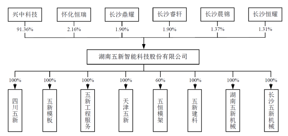 目前,兴中科技持有公司91.36%%的股权,为五新科技的控股股东。由于其股权结构分散,导致公司无实际控制人。
