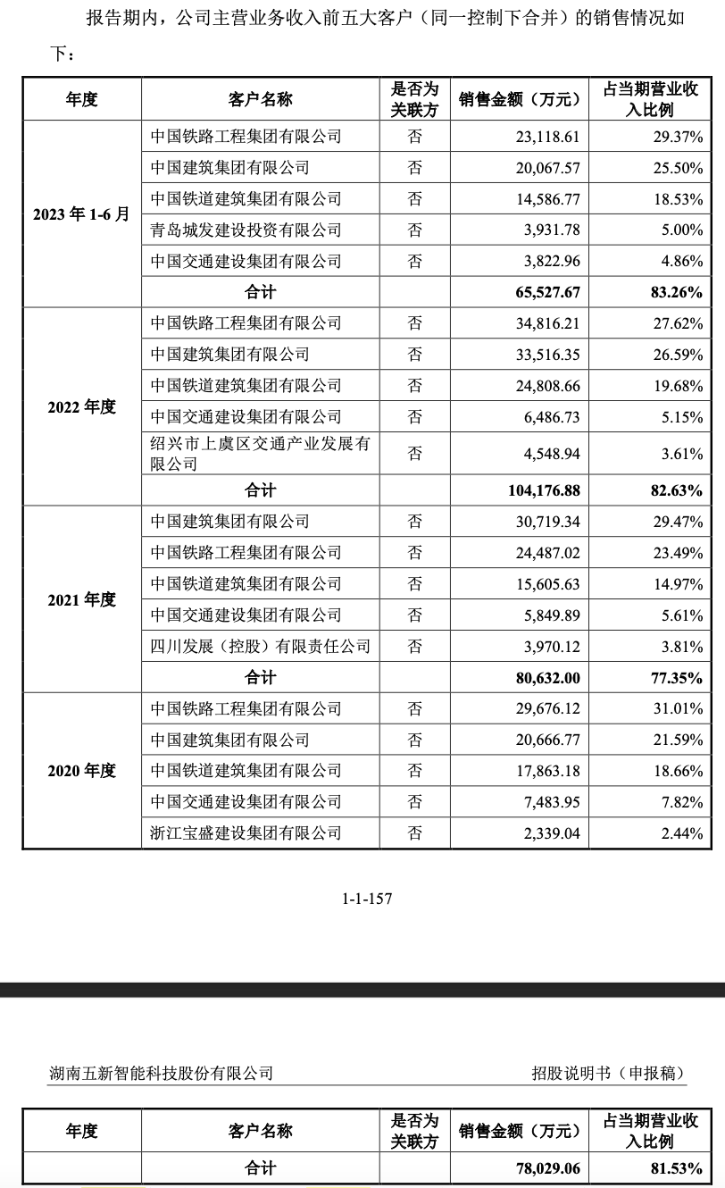 从下游客户来看,五新科技的客户主要为大型央企、国企施工企业,包括中国建筑、中国铁建、中国中铁、中国交建等。报告期内,公司对前五大客户销售金额合计占当期营业收入的比例分别为 81.53%、77.35%、82.63%和83.26%。