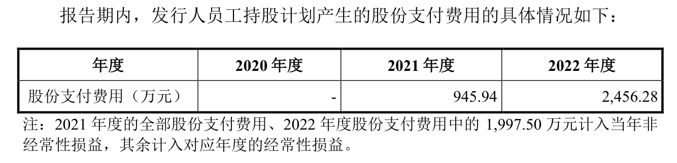 未扣非时湖州申科2022年营业收入增长的情况下,净利润不增甚至反降。从披露来看,2021年和2022年公司非经常性损益中“一次性计入当期损益的股份支付费用”分别为-1556.82万元和-1997.5万元,费用大头均源自这两年公司实施的员工持股计划。