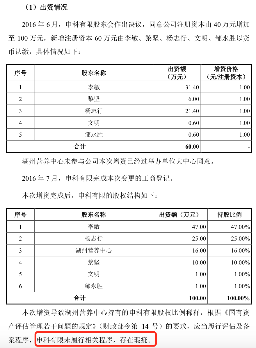 需要指出的是,申科有限的2016年6月第一次增资在流程上存在瑕疵,增持导致湖州营养中心股权比例稀释,根据《国有资产评估管理若干问题的规定》(财政部令第14号)的要求,应当履行评估及备案程序,申科有限未履行相关程序。