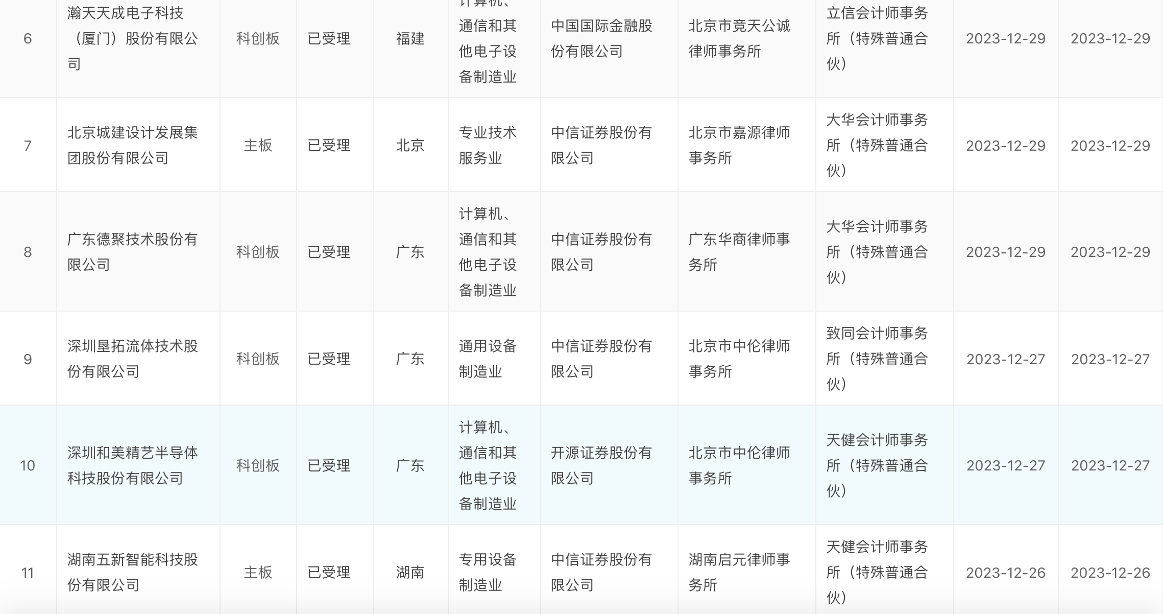 沪市方面,12月26日至12月30日共新受理了11家公司。这其中,融资金额最高的是瀚天天成电子科技(厦门)股份有限公司(下称瀚天天成),融资额35.03亿元,公司由中金公司保荐,所属行业为“计算机、通信和其他电子设备制造业”。瀚天天成是全球领先的宽禁带半导体(第三代半导体)外延晶片提供商,主要从事碳化硅外延晶片的研发、生产及销售,产品用于制备碳化硅功率器件,被广泛应用于新能源汽车、光伏发电、轨道交通、智能电网及航空航天等领域。说明书显示,根据CASA统计数据,按外销市场和自供市场全出货量统计(等效6英寸),瀚天天成2022年全球市场占有率约为19%;按外销市场出货量统计(等效6英寸),瀚天天成2022年全球市场占有率约为38%。