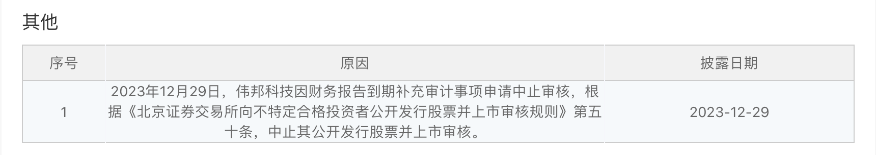 北交所方面,10月来,虽说新受理未有停滞,但数量不多。10月份只新受理3家,11月份新受理公司家数为9家,不过,12月里交易所共计新受理了44家公司,而这其中的34家,受理时间均在2023年最后一周内。这34家公司中,伟邦科技(873738.NQ)处于中止状态。根据披露,2023年12月29日,伟邦科技是因财务报告到期补充审计事项申请中止审核的。
