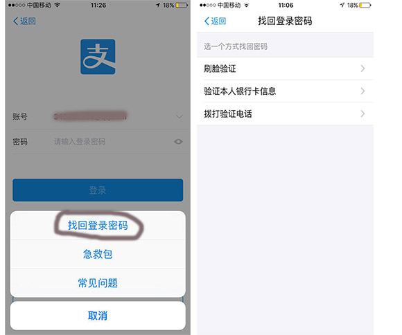 我们接到网友反映,称可以通过识别好友、识别近期购买物品,来找回支付宝登录密码。