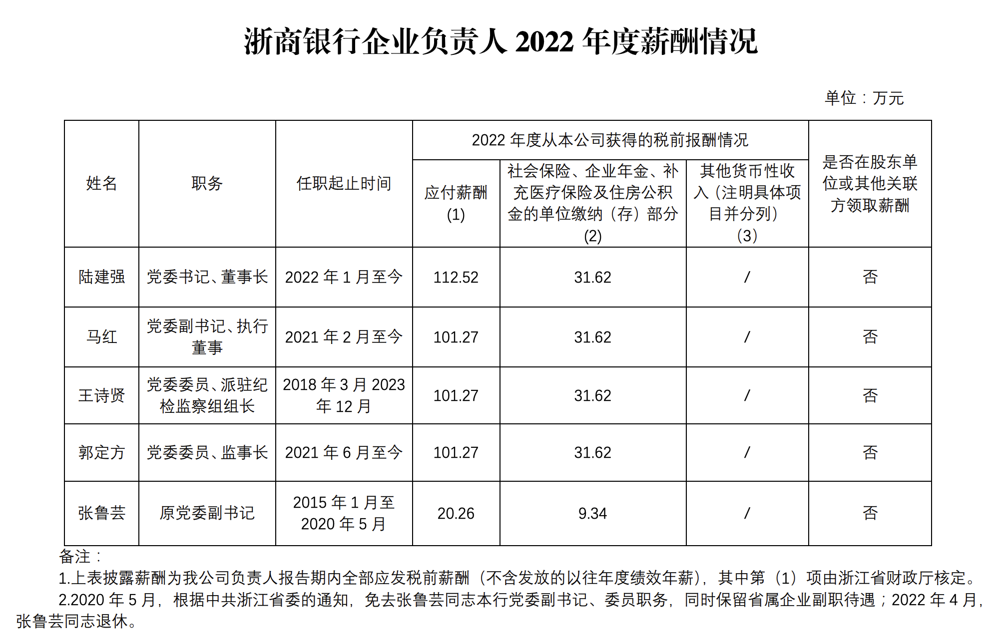 12月31日,浙商银行在官网披露企业负责人2022年度薪酬情况:
