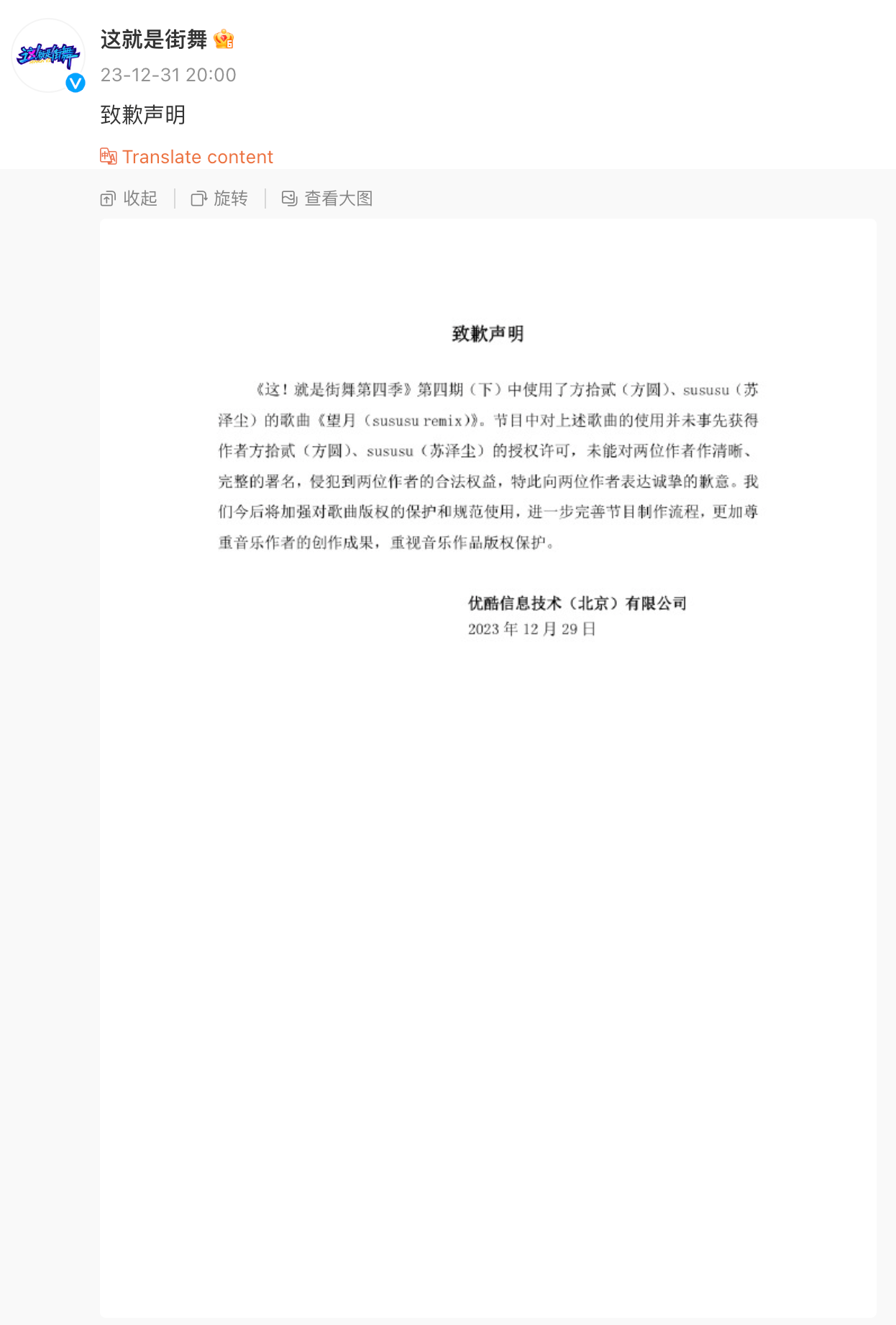 12月31日晚,优酷《这!就是街舞》官方微博发布致歉声明。声明称,《这!就是街舞第四季》第四期(下)中使用了方拾贰(方圆)、sususu(苏泽尘)的歌曲《望月(sususu remix)》。节目中对上述歌曲的使用并未事先获得作者的授权许可,未能对两位作者作清晰、完整的署名,侵犯到两位作者的合法权益,特此向两位作者表达诚挚的歉意。优酷方面称,“我们今后将加强对歌曲版权的保护和规范使用,进一步完善节目制作流程,更加尊重音乐作者的创作成果,重视音乐作品版权保护。”