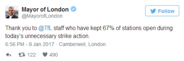 伦敦交通局表示,150辆公交车额外补充到了交通运输当中,但是很多车由于太拥挤而无法停下等待乘客。萨迪克·汗本人的父亲就是一名伦敦公交车司机,这位市长在之前的一条推特中表示此次罢工“完全没有必要”。