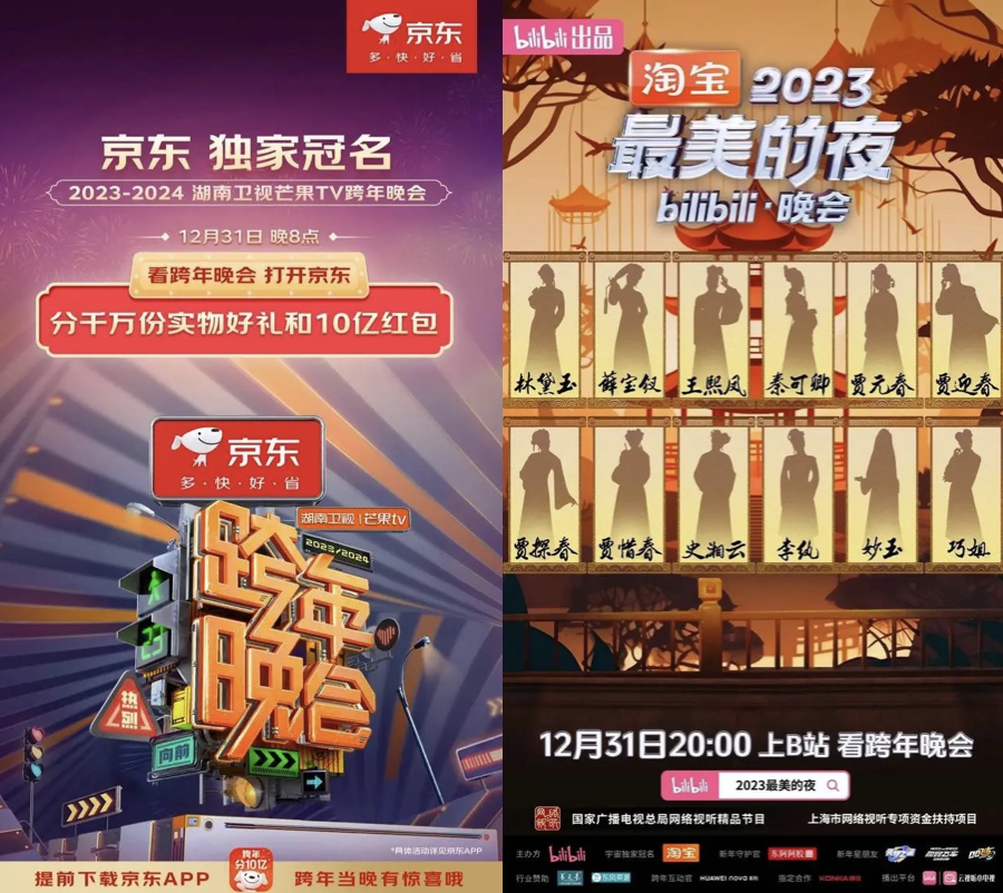 2023年12月31日晚,央视总台、湖南卫视、江苏卫视、浙江卫视、东方卫视、北京卫视、哔哩哔哩(下称B站)等纷纷开唱,表演应接不暇,数量与热度为近年来最强。
