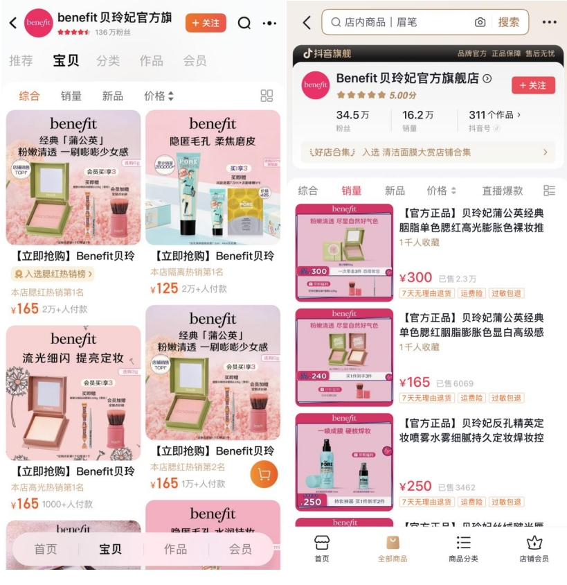 分别截自贝玲妃天猫、抖音官方旗舰店