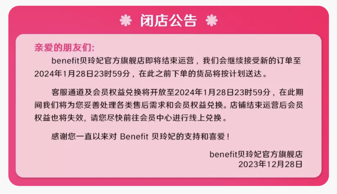近日,LVMH集团旗下高端彩妆品牌贝玲妃天猫、抖音、京东三大官方旗舰店齐发闭店公告,宣布即将结束运营,2024年1月28日后不再接受新订单。