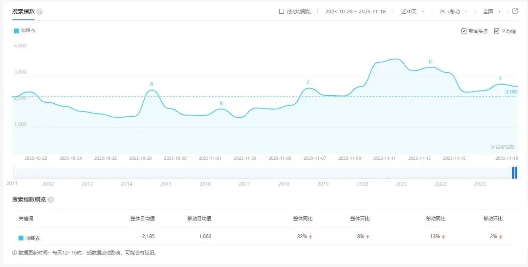 百度指数显示,今年以来,冲锋衣日均搜索指数超过了2180;新红数据显示,过去30天,#冲锋衣#话题在小红书总浏览量近2亿,热度超过93.41%的其他穿搭打扮相关词。