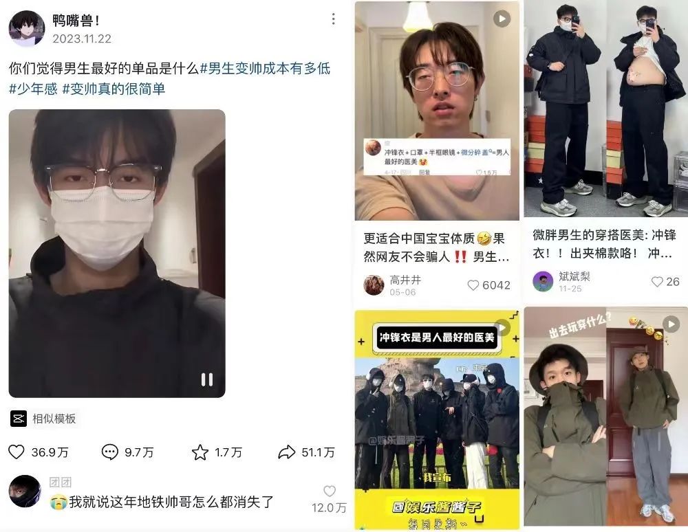 用户的争相模仿、自发传播,让“冲锋衣穿搭”就这样乘着“东风”,流传到更广泛的大众圈层。