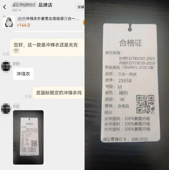 有消费者反映称,在电商平台购买的标题为“冲锋衣”字样的产品,购买时询问客服确认为冲锋衣,但实际收到货后,产品显示的执行标准为夹克服装所对应的执行标准;也有消费者购在收到货后找商家对质,客服却表示该产品“不是冲锋衣,而是冲锋衣的版型。”
