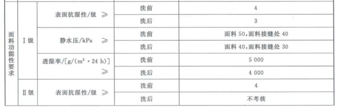 目前,冲锋衣对应的国家标准为GB/T 32614-2016《户外运动服装冲锋衣》,标准针对冲锋衣的面料功能也有详细的要求,包括抗湿性、静水压、透湿率等体现产品防风透湿性功能的参数。