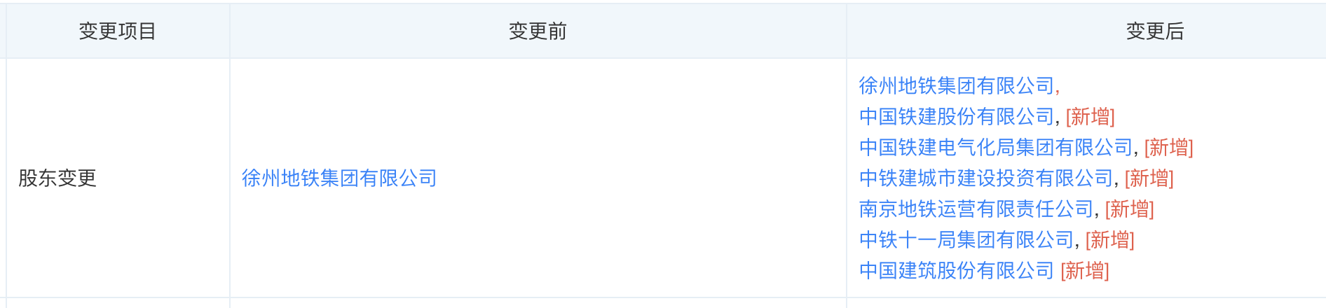 天眼查APP显示,近日,徐州地铁运营有限公司发生工商变更,公司注册资本增加至10亿元,新增股东中国铁建、中国建筑、中铁建城市建设投资有限公司等。