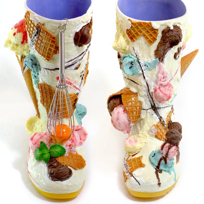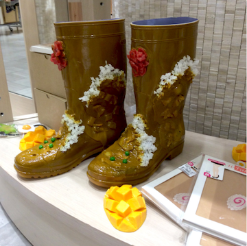 他们也在孜孜不倦地推出新品。除了最初的食品样本食物模型,去年又开发出一些衍生产品,比如鱼饼丝袜、咖喱雨鞋等等。
