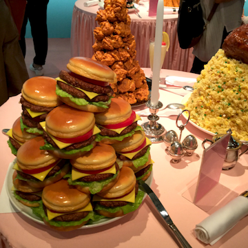 跨界合作也越来越多了:他们去年7月与日本正当红的时尚icon渡边直美合作,为她在原宿的展览制作了全部展出的食物模型。这位古灵精怪的大号女孩搭配各种超大盘仿真食物,有一种奇异的原宿时尚感。