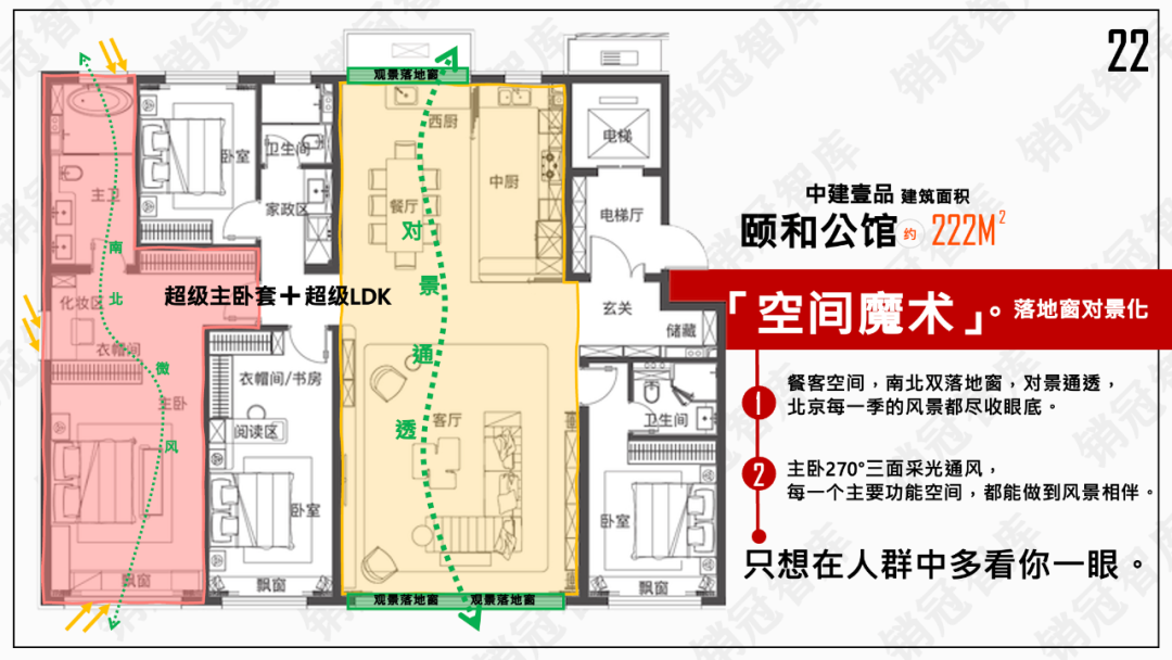 表妹想说的是,颐和公馆在动区LDK46平的大空间里,安排了南北两面落地窗,即「落地窗对景化」。