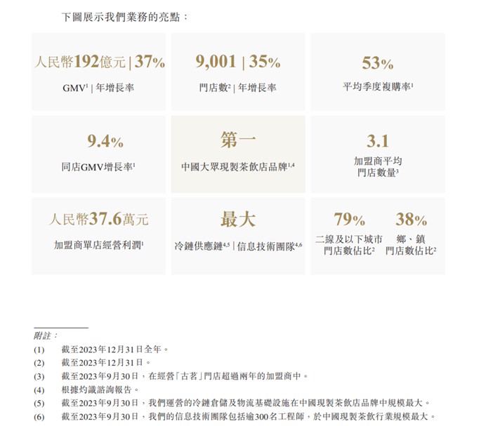 根据灼识咨询报告,按2023年的商品销售额(GMV)及门店数量计,古茗均是中国最大的大众现制茶饮店品牌(10元-20元价格带),亦是全价格带下中国第二大现制茶饮店品牌。按截至2023年底的门店数量计,古茗是全球前五大现制饮品品牌。
