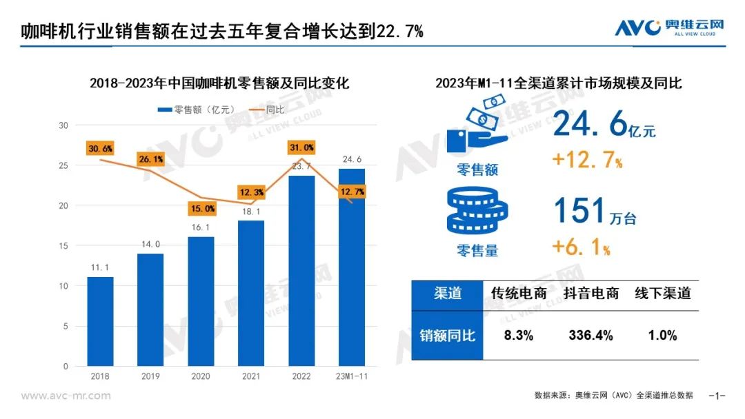 据奥维云网(AVC)推总数据显示,咖啡机行业销售额在过去五年复合增长达到22.7%,同时2023年1-11月行业整体规模达24.6亿元,同比12.7%,咖啡机行业的高增长也为厨房小家电行业注入了一剂强心针。