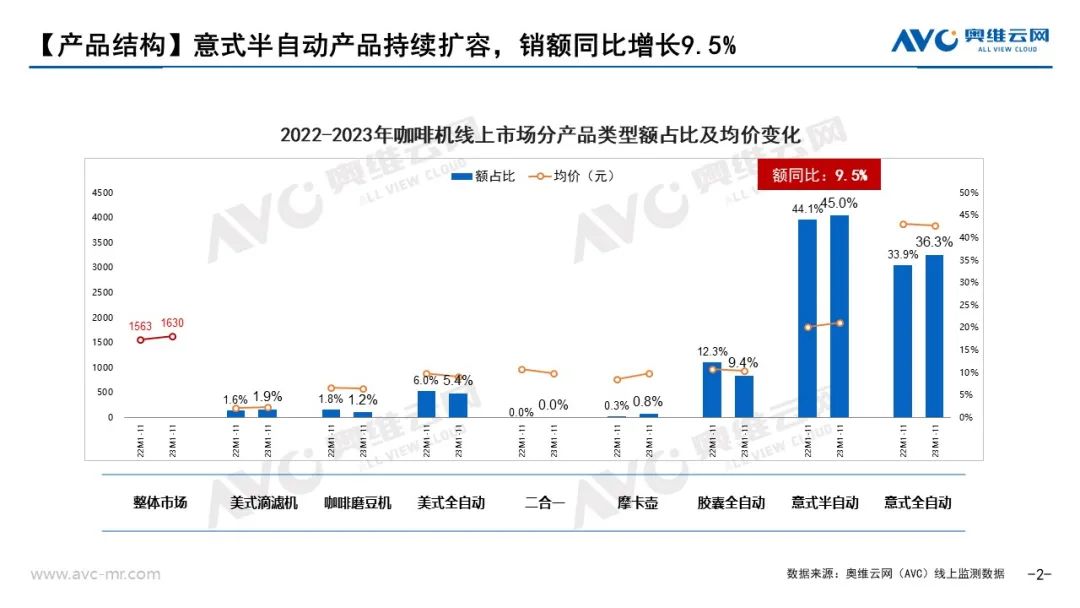 咖啡机品类价格分布从几百元到上万元不等,超长的价格线也呈现出了多样化的消费结构。其中意式产品价格相对较高,随着对应消费者基数的不断扩大,寻求更专业化的产品也成为更多人群的选择,据奥维云网(AVC)线上监测数据显示,2023年1-11月意式产品均价为2460元,同比增长4.0%,其中8000元以上产品额占比进一步增长0.4%达12.0%。
