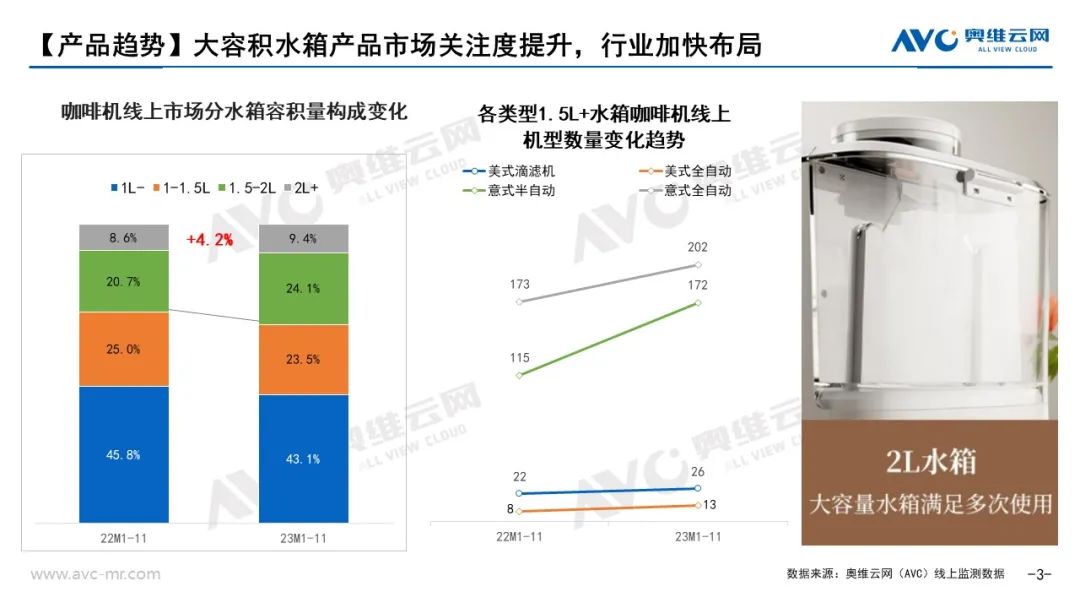 懒人经济之下,消费者对产品的便捷性要求更高。而对于咖啡机产品来说,水箱容量的大小也成为消费者比较关注的重点。据奥维云网(AVC)线上监测数据显示,2023年1-11月1.5L及以上水箱容积产品销额占比提升4.2%至33.5%,同时市场也在大力跟进相应产品布局,2023年1-11月1.5L及以上意式半自动机型数量同比去年同期增长56个达到172个。