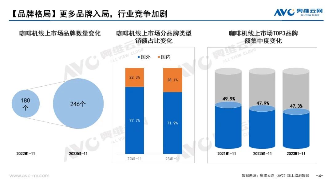 据奥维云网(AVC)线上监测数据显示,2023年1-11月咖啡机市场品牌数量达到246个,相较去年同期增长37%,其中国产品牌销额占比增长5.8%至28.1%,国产品牌开始大范围入局发力。同时随着更多品牌的入局,头部品牌集中度也开始呈现下降,TOP3品牌额集中度从21年的49.9%下降至23年的47.3%,长尾品牌基数扩大,大家都想在这个高增长品类中分得一杯羹,竞争也将进一步加剧。