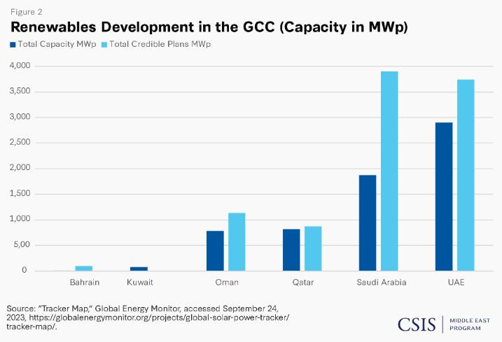 海湾国家合作委员会的可再生能源发展(容量以 MWp 为单位) 数据截至2023年9月