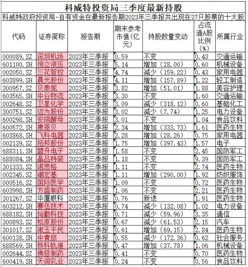 另一位沙特投资巨头科威特投资局则在27家A股企业占据前十大股东,持有市值为49.47亿元,虽然数据相较于年中有所下降,但仍高于去年同期。