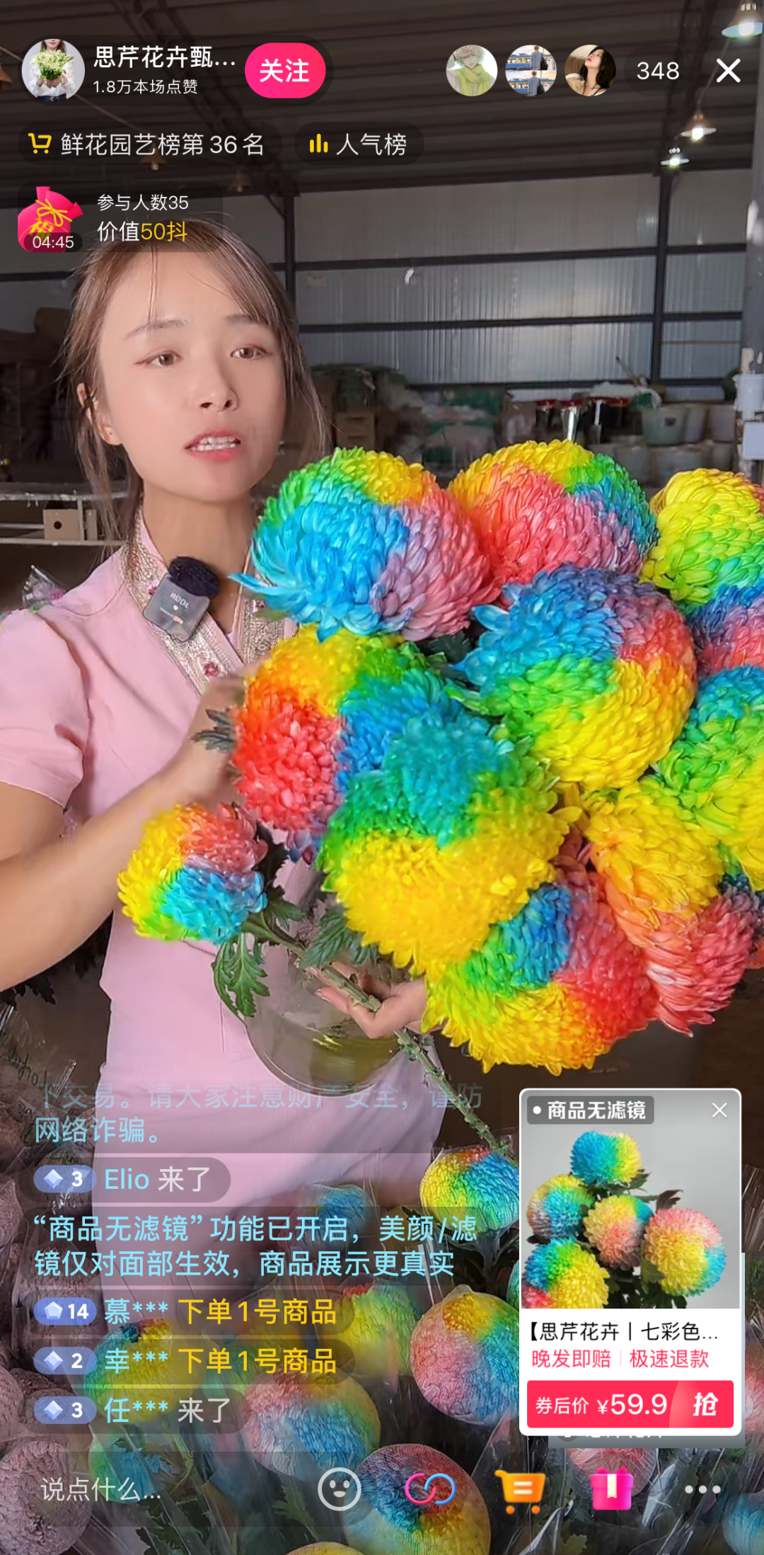 的确,某种程度上直播电商正在冲击拍市原本稳固的模式。杨勇告诉剁椒,因为统计口径问题,数据没有十分精准,但抖音电商在今年七夕根据物流端反馈做了一次统计,从抖音电商卖出的鲜花,占云南七夕节鲜花出港量的40%。拍市的占比不超过30%。直播电商势头很猛。