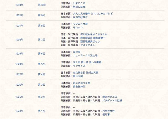 不仅如此,始于1924年的旬报十佳评选(《电影旬报》官网洋洋得意地标榜其历史之久远,比奥斯卡金像奖还要早一年),以日本电影质量不佳为由,最初仅以欧美电影为评选对象,分为艺术电影与娱乐电影两个十佳榜单(于第一届旬报十佳拔得头筹的分别为查理·卓别林的《巴黎一妇人》与詹姆斯 克鲁兹的《篷车队》)。1926年,旬报认为日本电影的水准获得一定的提高后,才将日影也纳入考量,于日本电影与外国电影中分别选出十佳,最初荣获第一的日影是阿部丰导演的《碰脚的女人》(引用自豆瓣网的片名翻译,原题为『足にさはった女』)。
