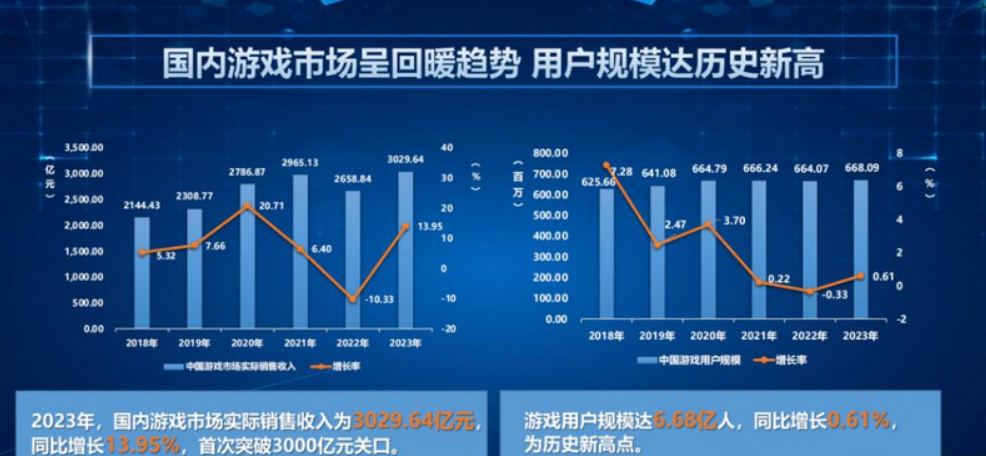 据中国游戏产业年会上公布的《2023年中国游戏产业报告》数据,2023年国内游戏市场实际销售收入3029.64亿元,同比增长13.95%,首次突破3000亿元;用户规模达到历史新高,达到6.68亿人。