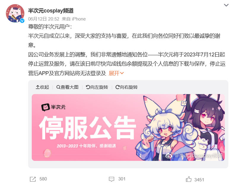 另有大变动的ACG平台是于2023年年中停运的半次元,其APP和官网自7月12日起无法登录及访问。半次元于2014年开始运营,平台内容集中于Cosplay、绘画等方面,于2018年被字节跳动收购。