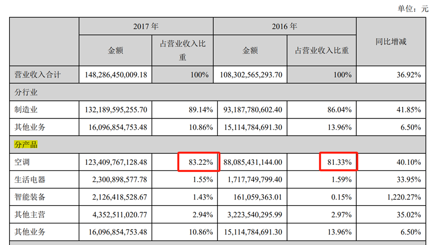 从格力的财报来看,目前格力空调产品占营收的比重已经稳定在70%左右,而这一数字在2016与2017年超过80%。
