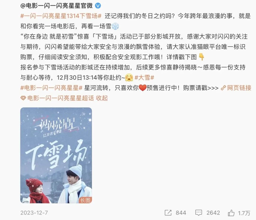 电影《一闪一闪亮星星》自开拍定档之初,就紧紧围绕着“雪”为核心,进行发散式宣传,一边发挥剧集IP的长尾效应,拉拢稳定的剧集粉丝关注,另一边,用营造的仪式感刺激潜在观众的需求,“跨年下雪”渐渐在观众心中形成强印象。
