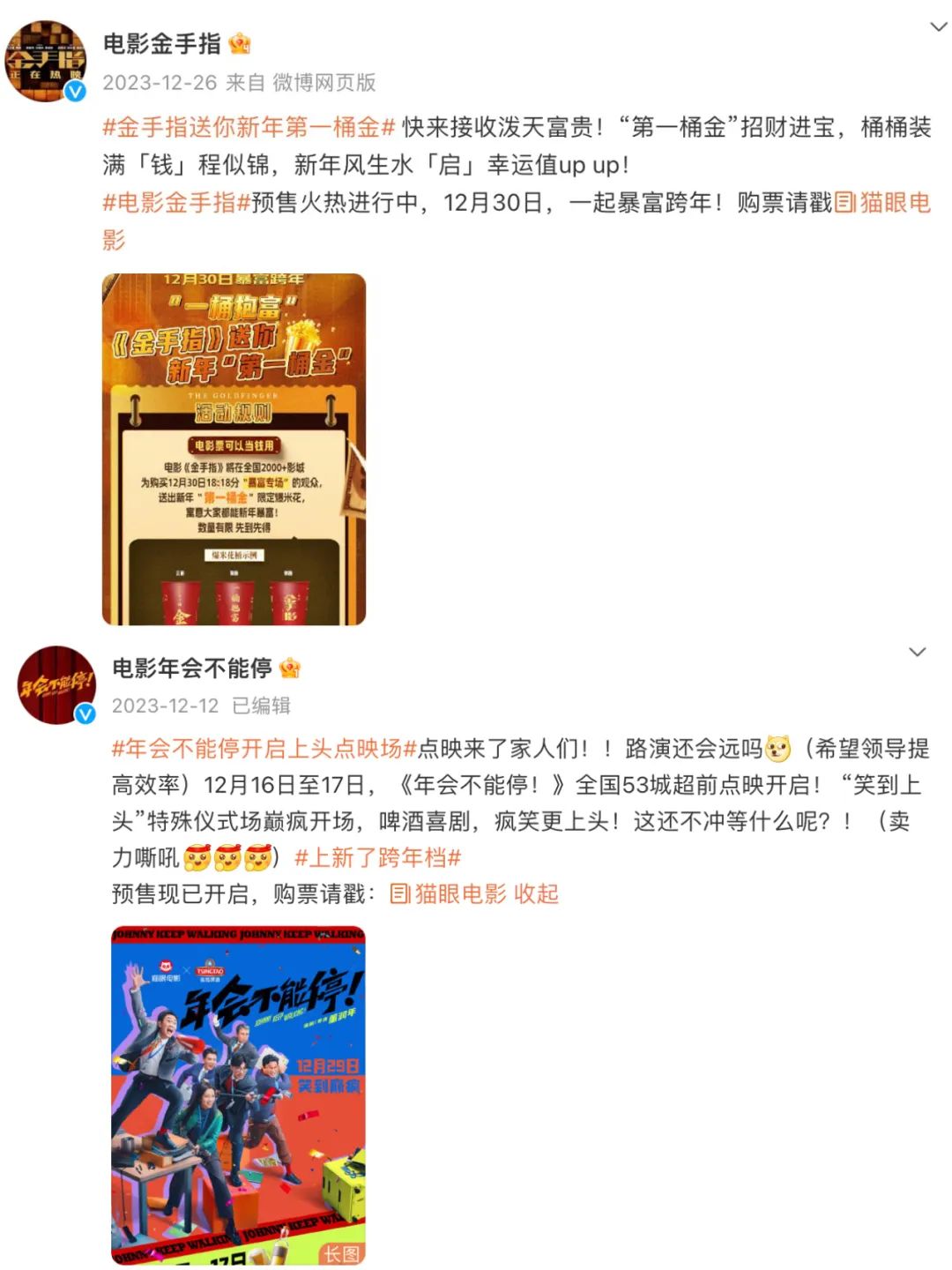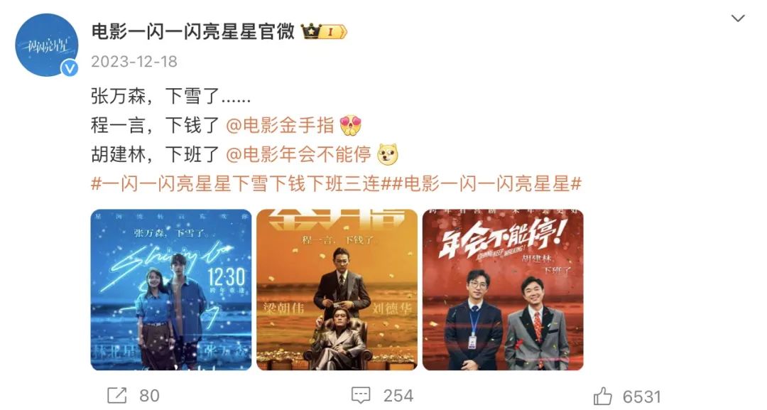 比如,《一闪一闪亮星星》的经典场景“张万森,下雪了”出圈之后,官微活学活用,借梗宣传其它两部电影:“程一言,下钱了@电影金手指 ;胡建林,下班了@电影年会不能停”。