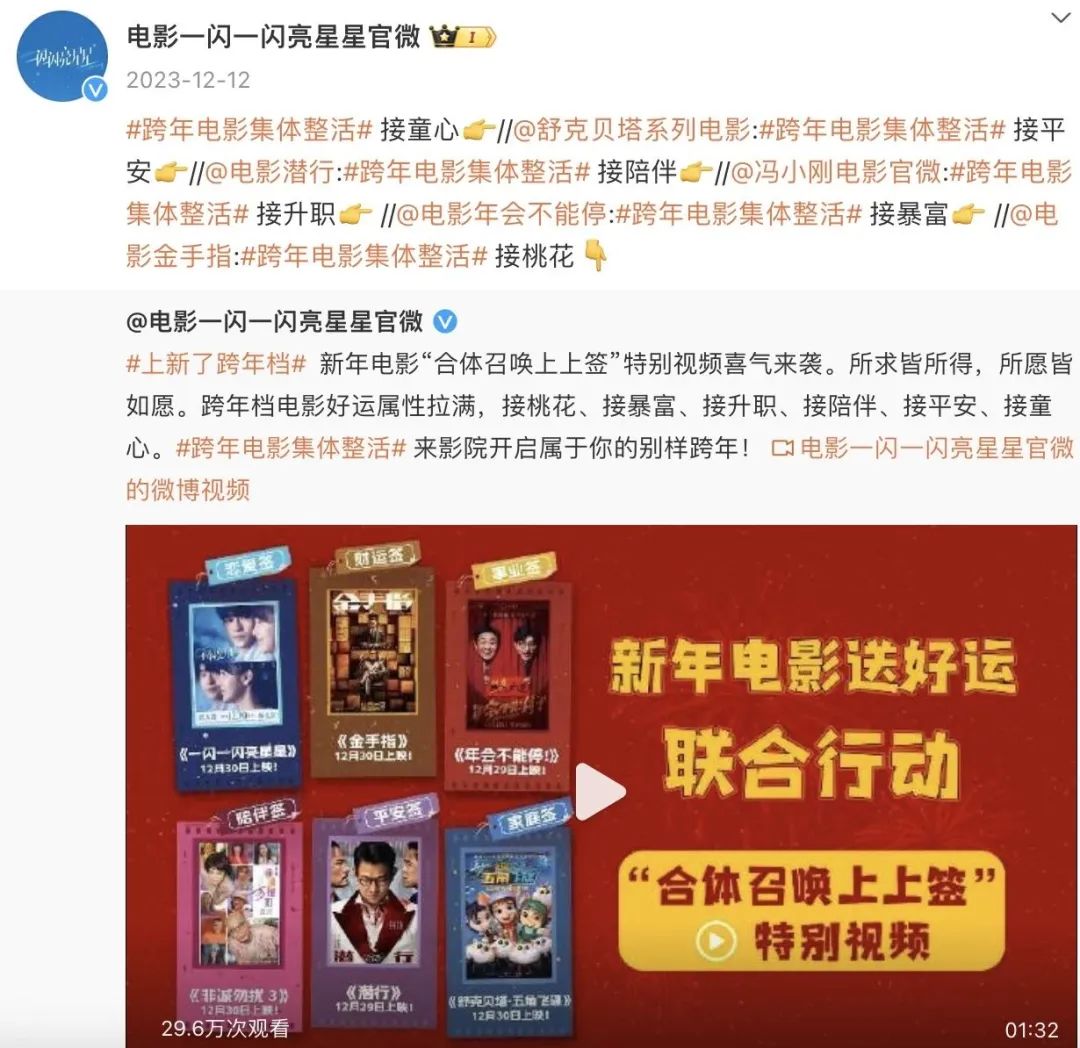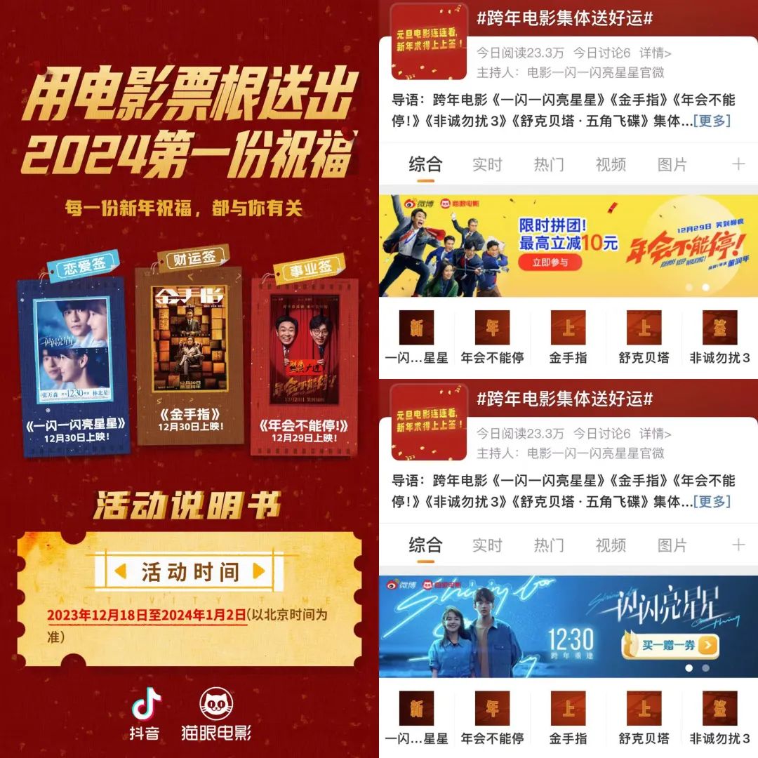另一方面,各片官方社交平台互动转发,发布共创内容,比如,在抖音“征集票根官方活动”,或是微博发起的“限时拼团观影福利”,都是在利用社交平台属性为影片互增声量。
