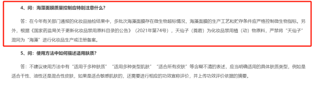 2023年,芋螺肽化妆品和海藻面膜接连被官方“点名”。广州市监局在《普通化妆品备案问答(四十期)》中指出,“芋螺肽”是维琪科技于2023年备案的化妆品新原料,未添加该新原料而已备案宣称“芋螺肽”的化妆品,需尽快修改相关宣称;《普通化妆品备案问答(五十一期)》指出,在过去一年的官方抽检和行政处罚中,海藻面膜多次因微生物超标榜上有名,而罪魁祸首是添加了禁用原料“天仙子”,“严禁将‘天仙子’混同为‘海藻’进行化妆品生产或注册备案”。