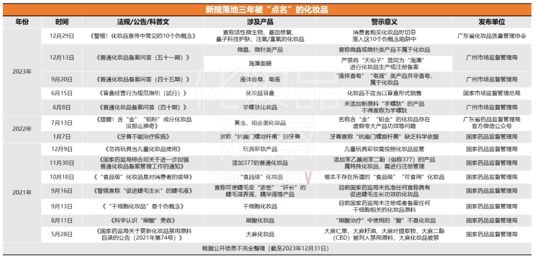 2023年岁末,广东省药监局直属化妆品协会官宣平台“广东省化妆品质量管理协会”发布科普文《警惕!化妆品宣传中常见的10个伪概念》,再次重申药妆、干细胞、EGF(表皮生长因子)、黄金美容、械字号面膜/医美面膜、食品级化妆品为“伪概念”,并首次将活性微生物、基因修复、量子科技护肤、注氧/富氧4类宣称列入“黑名单”,明确标签含有上述10类宣称的化妆品属于违法产品。