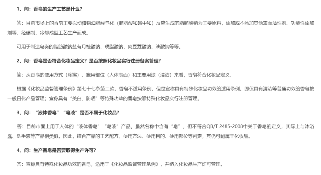 如,广州市监局发布的《普通化妆品备案问答(四十五期)》强调,市面上用于人体的“液体香皂”“皂液”产品,虽然名称中含有“皂”,但实际上与沐浴露、洗手液等产品相类似,其仍可能属于化妆品(详情见《注意!这类化妆品面临“大清洗”》)。