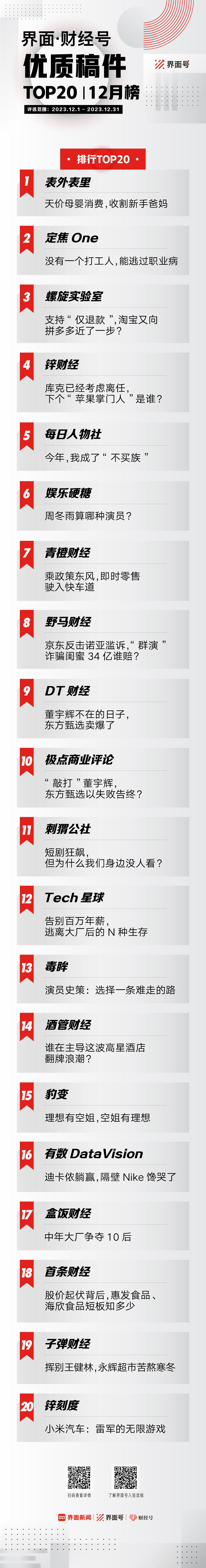 行走烟火人间,穿越四季光阴,界面·财经号1000多位成员立足于现实生活,持续观察千姿百态的商业现象,破解商业世界背后的秘密,在2023年12月1日至12月31日期间累计发文近2000篇。其中,以下20篇稿件脱颖而出,荣登《界面.财经号优质稿件TOP20|12月榜》,用原创彰显独立思考的力量。