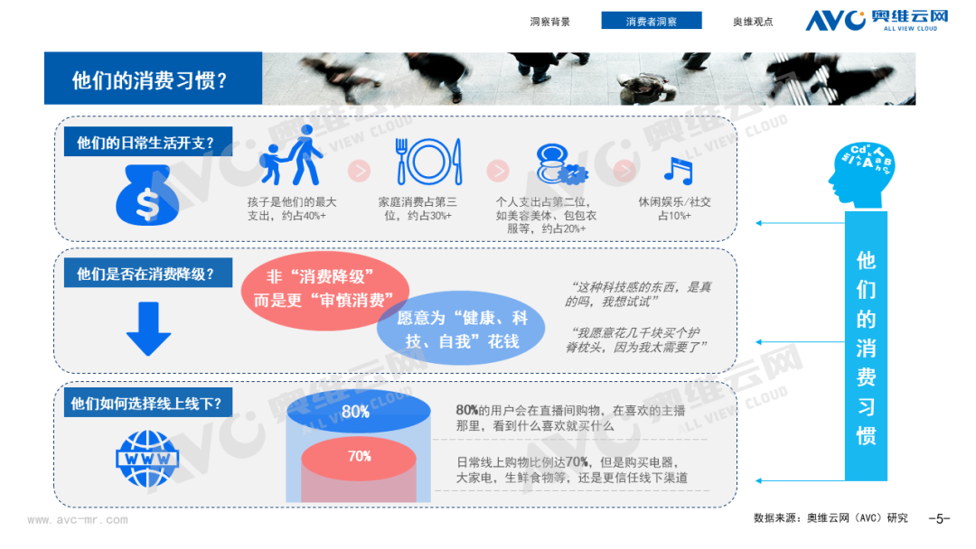 他们的日常开销大,孩子是他们的主要开销,其次是家庭支出、个人支出。他们对线上购物及直播间购物,有很大的接受度。