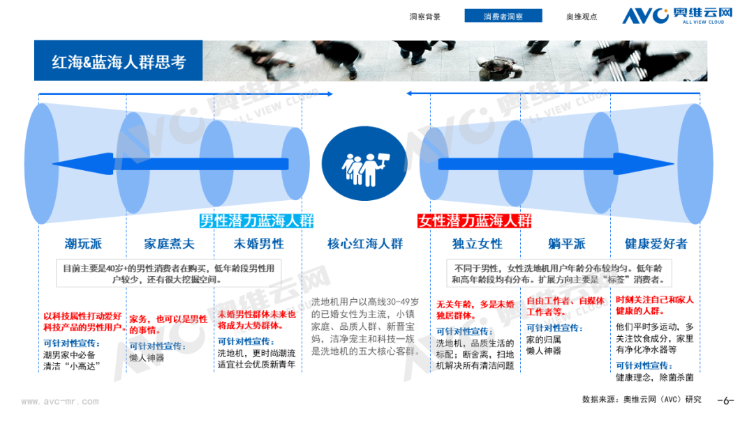 洗地机中高端客户以高线30-49岁的已婚女性为主流,小镇家庭、品质人群、新晋宝妈,洁净宠主和科技一族是洗地机的五大核心客群。但随着中国消费行业和消费者结构的不断变化,一些未知蓝海中的非核心人群,也值得引起品牌的关注。这些潜力人群,收入水平虽不及中产群体,但也有高端消费的潜力。我们认为未来主要蓝海人群有:独立女性、躺平派、健康爱好者、未婚男性等。戳→奥维数据罗盘
