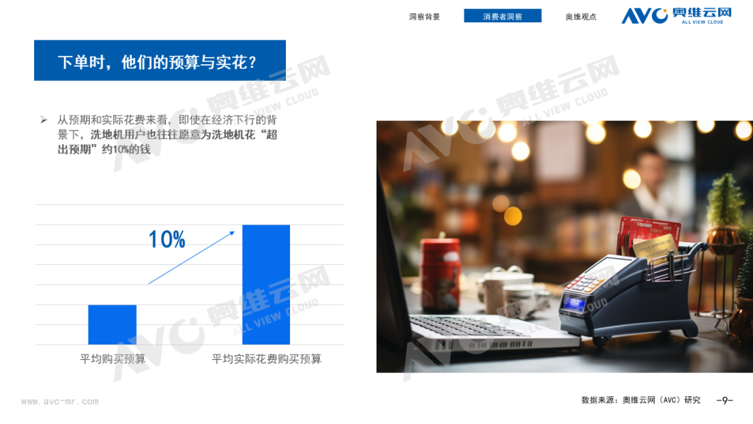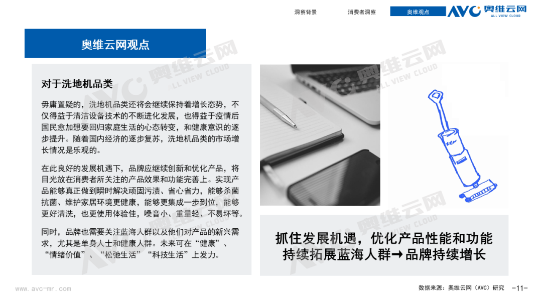 奥维云网观点:毋庸置疑的,洗地机品类还将会继续保持增长态势。品牌应抓住发展机遇,按用户需求与想法优化产品性能、功能。且在消费趋势变化的风口下,提前获知消费者想法,提前做好产品规划和布局,才能保障品牌在洗地机赛道的持续健康增长。