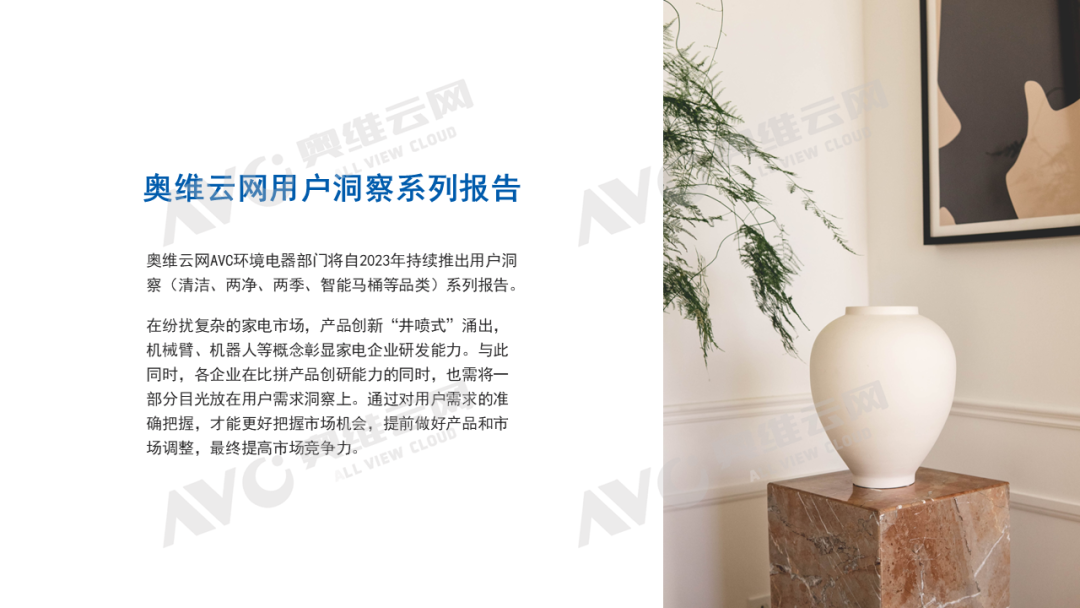 奥维云网(AVC)环境健康电器事业部将自2024年持续推出用户洞察(清洁、两净、两季、智能马桶等品类)系列报告。