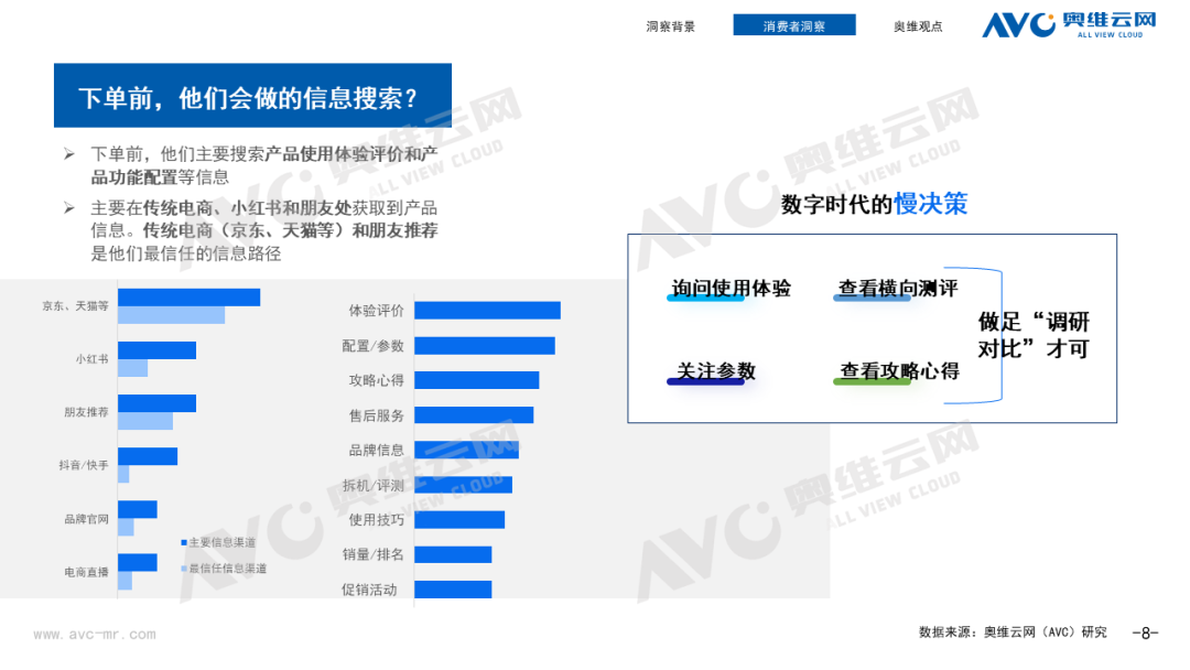 下单前,他们会搜索产品使用体验评价和产品功能配置等信息。多方位思考和对比后才会最终下单。除了在传统电商搜索配置信息和在小红书上搜索体验评价外,朋友处获取信息也是他们了解产品的重要途径,也是他们除了传统电商(京东、天猫等)外,最信任的信息路径。