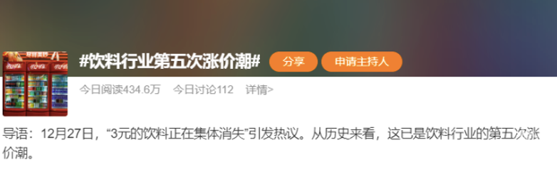 我国饮料市场的变革仍在加速进行。近日,#3块钱的饮料正在集体消失#再次登上微博热搜。从历史来看,这已经是饮料行业的第五次涨价潮。