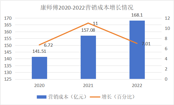 因此,即便在业绩增速疲软的两年里,康师傅的营销成本也在逐年增加。2020-2022年,康师傅营销成本分别为141.51亿元、157.08亿元、168.10亿元,增长幅度分别为6.72%、11%、7.01%。